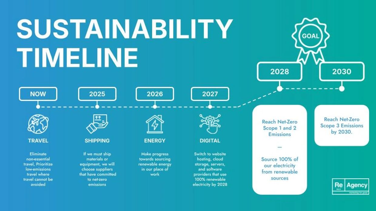 SUBSTITUTE: Sourcing 100% of our electricity from renewable sources by 2028. For ReAgency, this means sourcing the energy for our computers, lighting, heating, and cooling from renewable sources.